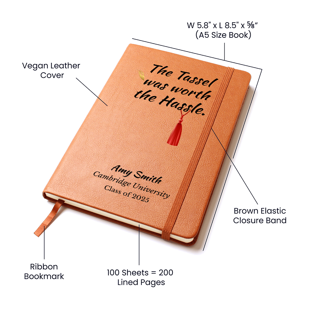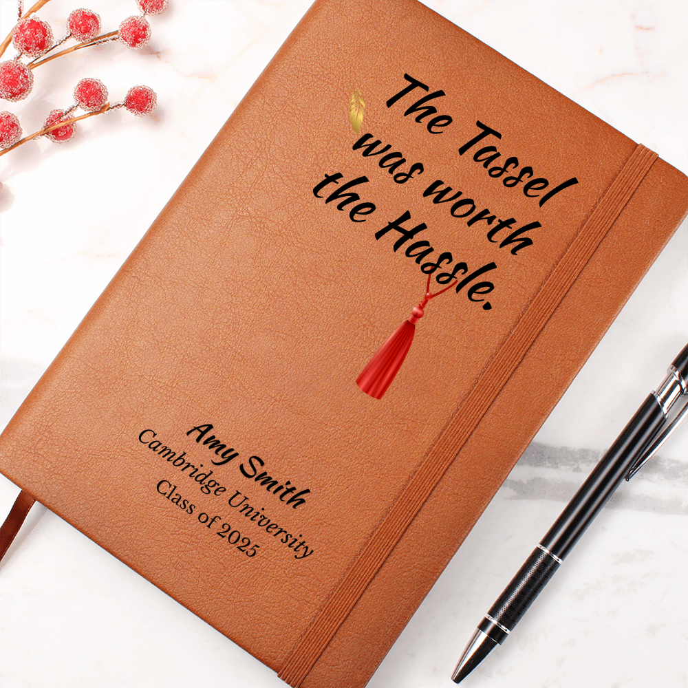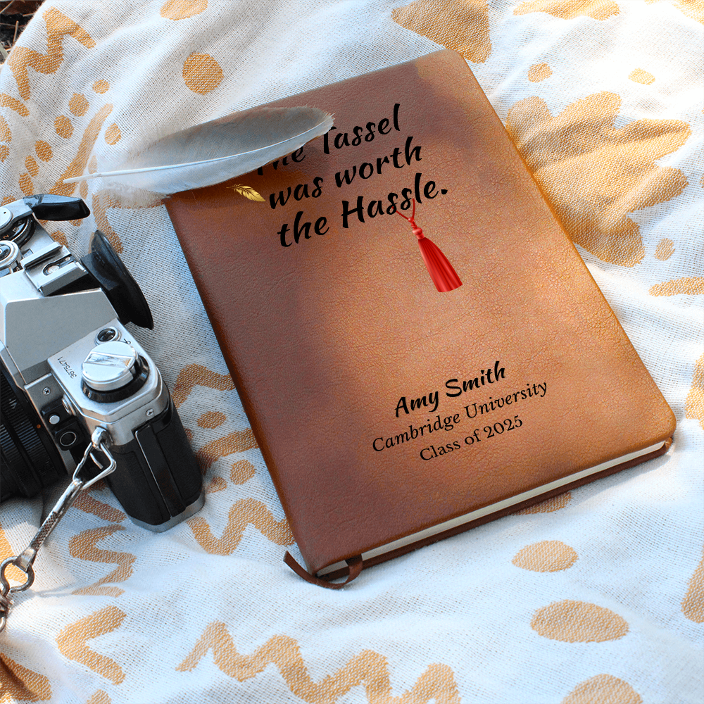 Celebrate the graduate’s strength and journey with this personalized leather-bound notebook. The quote, "The tassel was worth the hassle," is a proud reminder of her resilience, and the custom name and school details make it a keepsake she’ll treasure forever.